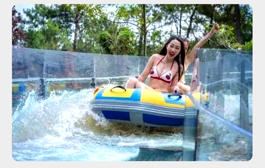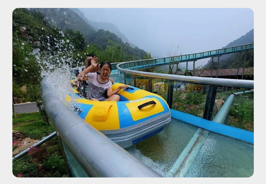 一是,依據(jù)大型生態(tài)漂流的體驗感,設(shè)計優(yōu)化升級而來。依地勢修建漂流槽,槽內(nèi)水深約20公分,水在漂流槽中托船順流而下,速度可控,刺激與安全兼得,確保百分之三百的安全。在設(shè)計上我們可以做到游客在漂流過程中基本不濕衣物。我們暫且稱這種形式的漂流為水滑道漂流。